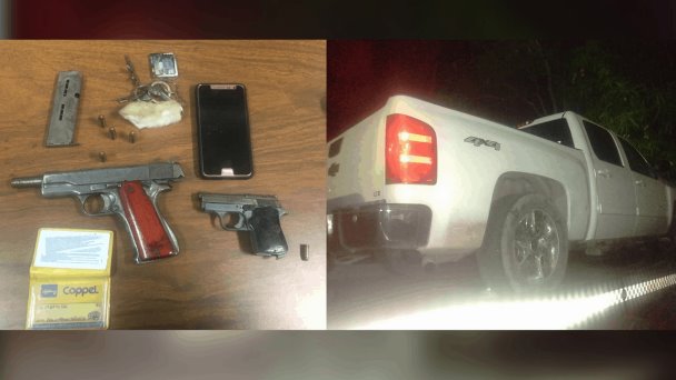 Cuando la policía llegó al lugar, encontraron la camioneta con las puertas abiertas, y dentro de ella se localizaron una pistola calibre 38, cargadores para un arma 9 milímetros, una pistola modelo VT 27 Titan MFG CORP, calibre 25 automática sin cargador, y un cartucho útil calibre 25. Además de un celular, un juego de 6 llaves con un foto llavero y un porta credenciales.