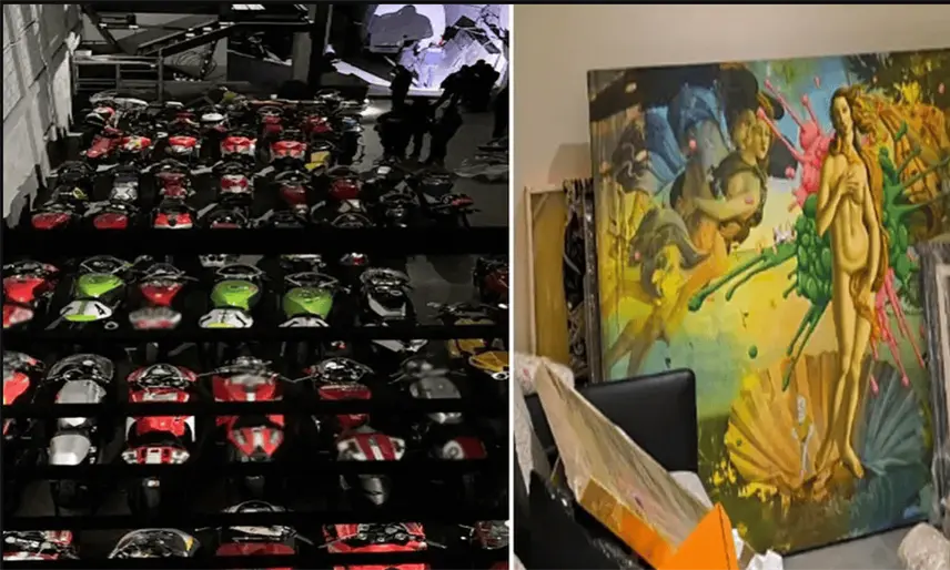 Las autoridades detallaron que hallaron dosis de metanfetamina y marihuana, 62 motocicletas de alta gama, dos vehículos, obras de arte, dos medallas olímpicas, cartuchos, un cargador y diversa documentación.