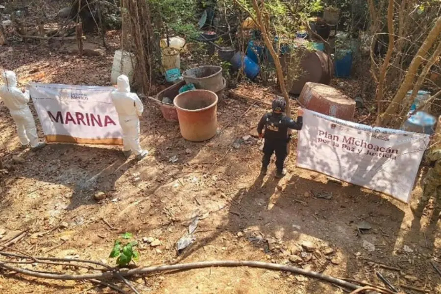 Mientras que en Michoacán fueron decomisados 500 kilos y nueve mil 700 litros de precursores químicos, equipo, así como herramientas de laboratorio en la localidad La Escondida.