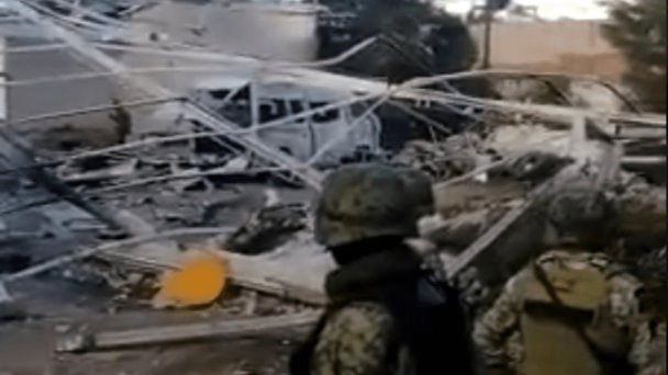 En la grabación se observa cómo soldados están parados frente a una estructura calcinada, en donde también se aprecia con afectaciones una unidad tipo Urvan, árboles y una tienda del lugar.