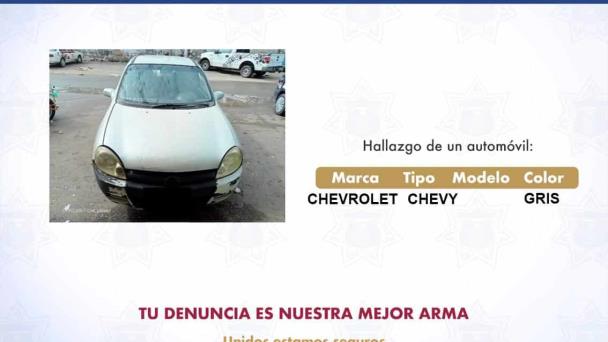 Finalmente, la Policía Estatal recuperó en la colonia Casa Blanca un auto de la marca Chevy, color gris y en el fraccionamiento Carlos Pellicer Cámara se recuperó una motocicleta Italika FT-150 de color negra con roja; ambas unidades contaban con reporte de robo.
