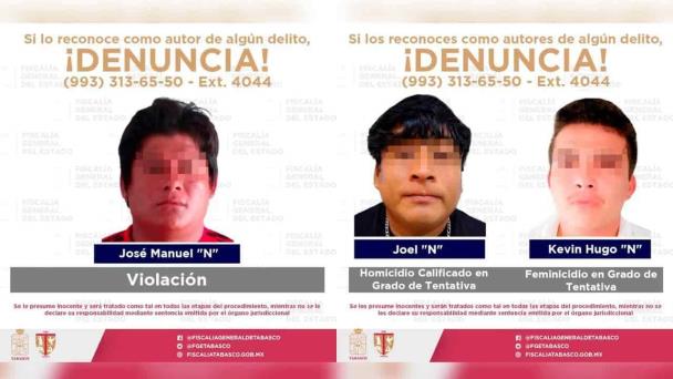 En un comunicado, la Fiscalía informó que se dio cumplimiento a órdenes de aprehensión contra Joel “N” en Villahermosa, por su presunta responsabilidad en el delito de homicidio calificado en grado de tentativa, mientras que Kevin Hugo “N” fue asegurado en Paraíso por el delito de feminicidio en grado de tentativa.