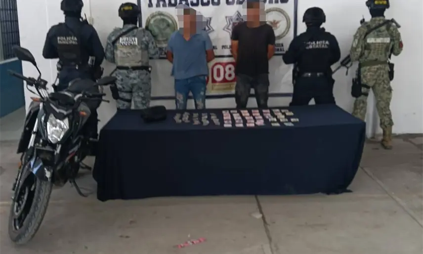 Un operativo conjunto de fuerzas municipales, estatales y federales derivó en la detención de dos presuntos narcomenudistas en el fraccionamiento Asturia, de Comalcalco.