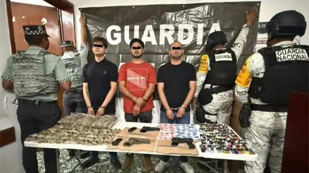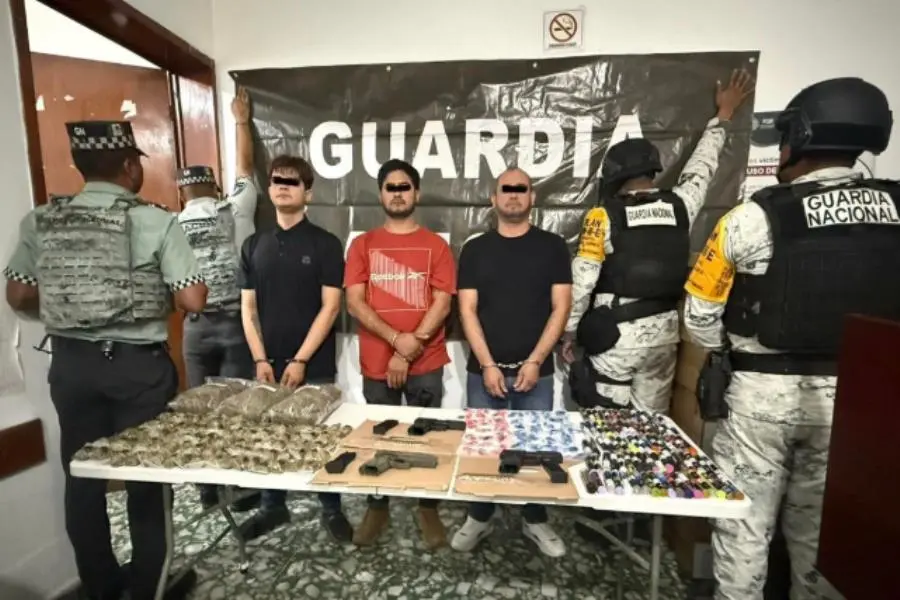 Según fuentes de seguridad, los tres detenidos viajaban a bordo de una camioneta Honda CRV blanca, en la carretera federal México 200, cuando fueron interceptados por elementos de la Guardia Nacional.