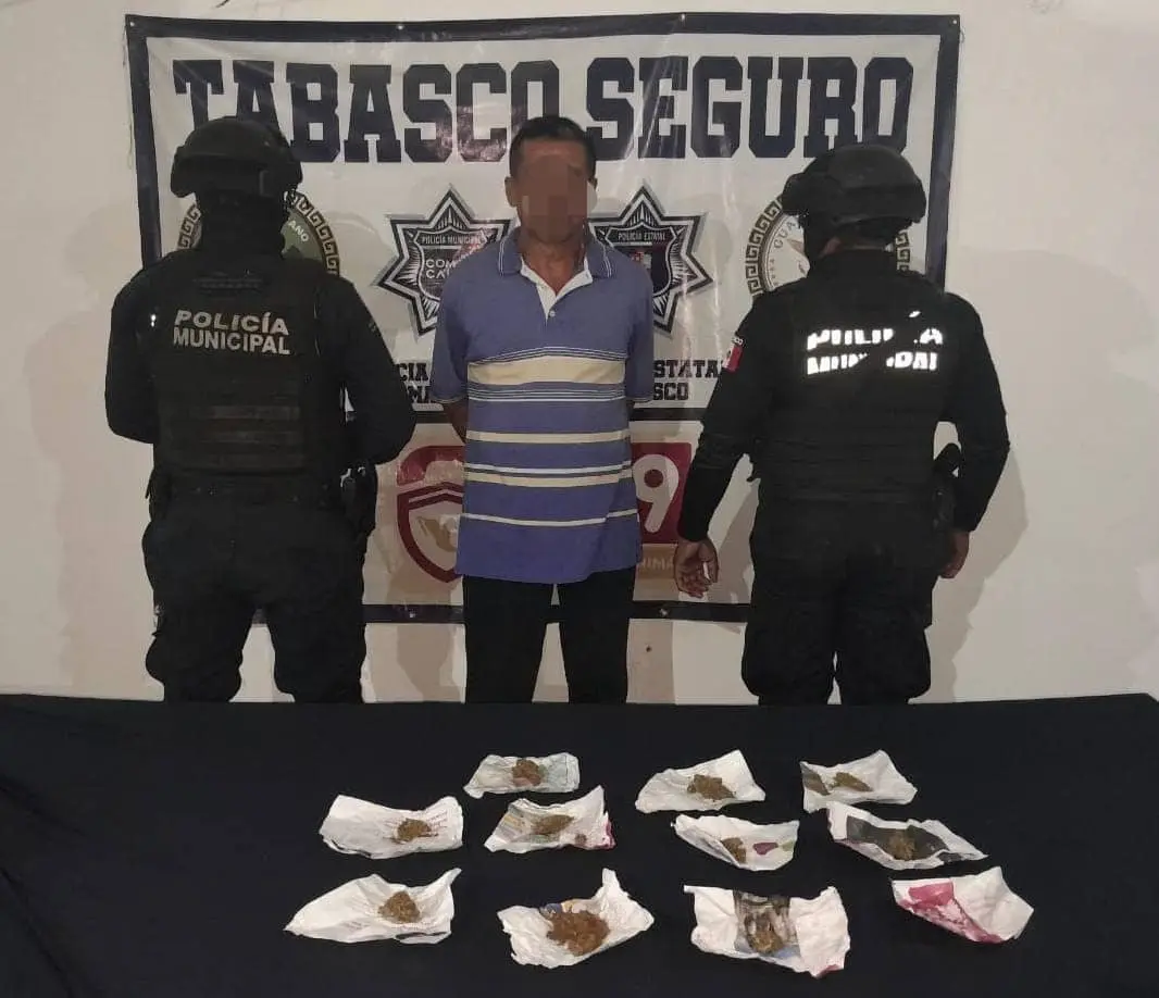 En un comunicado, la Policía Municipal informó que en la ranchería Reyes Hernández primera sección aprehendieron a un sujeto en posesión de marihuana, cocaína y un arma réplica.
