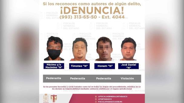 A través de un comunicado, dio a conocer que en un primer momento aseguraron a Máximo y/o Maximino “N”, quien fue presentado ante el Juez de Control radicado en Emiliano Zapata; esta persona fue localizada en colaboración con elementos de la Agencia Estatal de Investigación de la Fiscalía de Campeche. Su detención se llevó a cabo en esa entidad y fue trasladado a Tabasco como presunto responsable de pederastia.