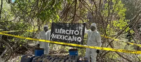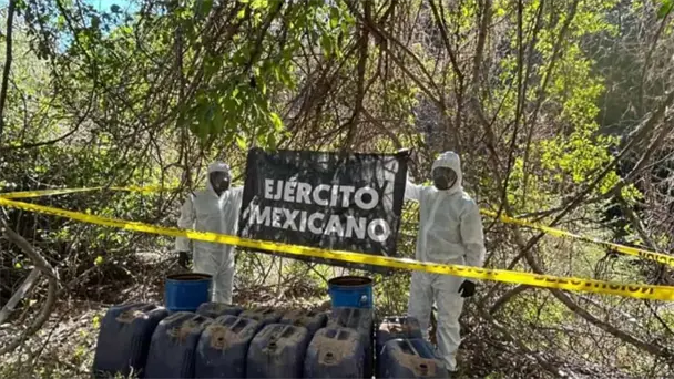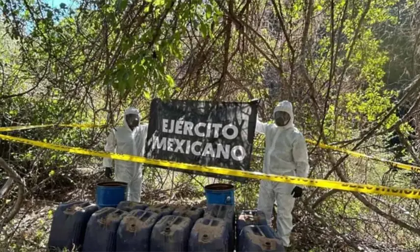 "En Culiacán, Sinaloa, en el poblado Corral Viejo, elementos del Ejército Mexicano localizaron e inhabilitaron un área de concentración de material diverso para la elaboración de metanfetamina, asegurando 2 mil 220 litros de sustancias químicas".