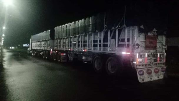 Dos tractocamiones con dos remolques cada uno fueron asegurados con 80 toneladas de azúcar de procedencia ilegal por elementos de la Fiscalía General de la República (FGR) en Macuspana.