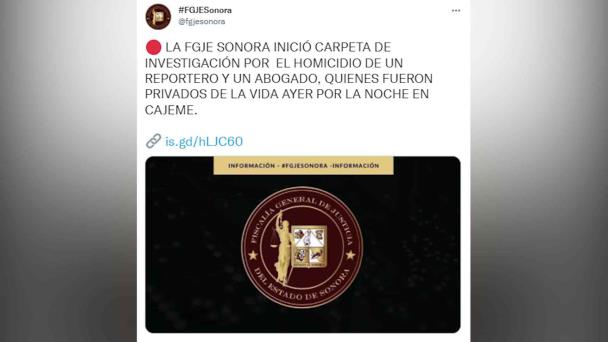 El comunicador, quien era reportero del portal digital “Cajeme News”, y el abogado Masami Alejandro Nikaido Rivera, quien también perdió la vida en el mismo hecho, presentaban impactos de bala de armas largas, al igual que el vehículo tipo vagoneta marca Jeep, en el que se encontraban.