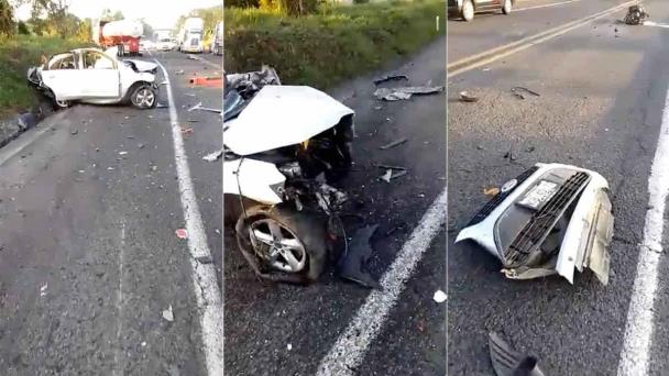 En la grabación se observan restos de diferentes autopartes regadas en el pavimento, así como un vehículo de la marca Ford, color gris, placas NGB-4377 del Estado de México, con pérdida total, y con los cuatro tripulantes prensados al interior.