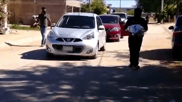 Además, se pueden ver tres unidades, (un coche tipo Sentra, una camioneta Pick-up y un auto Micra), en el que son transportadas las bolsas con productos, las cuales llevan etiquetas con las letras “AS”.