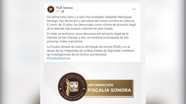 “De última hora: sano y salvo fue localizado Sebastián Manríquez Verdugo, hijo del locutor y periodista del mismo nombre en Caborca. El joven, de 23 años, fue denunciado como víctima de privación ilegal de la libertad, tras sucesos violentos en esta ciudad”, señaló la Fiscalía.