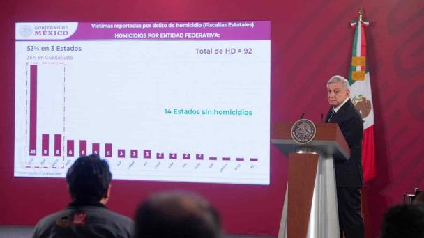 López Obrador mostró una gráfica donde aseguró que de acuerdo a datos de la Secretaría de Seguridad y Protección Ciudadana, el miércoles se registraron en todo el país 92 homicidios dolosos, de los cuales 33 se presentaron en Guanajuato.