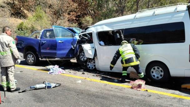 Según los primeros reportes, una camioneta tipo Ranger invadió el carril contrario y chocó de frente con una Urvan del transporte público.