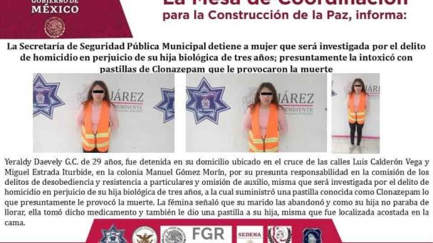 Por suministrarle clonazepam y matar a su hija de tres años, una mujer de Ciudad Juárez, Chihuahua, fue detenida por la policía.