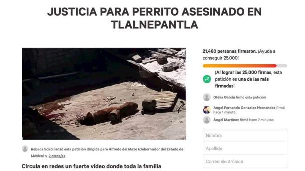 Luego de que un perro en Tlanepantla, Estado de México, fuera brutalmente asesinado por la familia que lo tenía a su cargo, algunas personas a través de la plataforma Change.org, han pedido a ciudadanos que firmen la petición para exigir justicia para el animal y se castigue a los responsables.