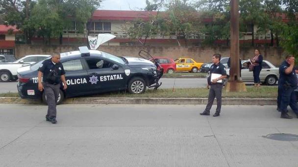 Dos elementos de la Policía Estatal resultaron lesionados, luego de que perdieron el control de la patrulla en la que circulaban, lo que provocó que terminaran arriba del camellón en el periférico de la ciudad de Villahermosa.