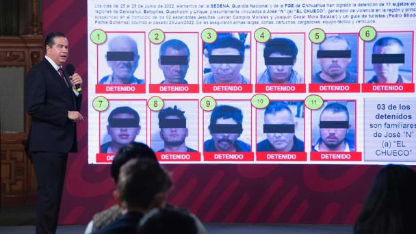 El subsecretario de Seguridad Pública, Ricardo Mejía Berdeja, informó que se ha detenido a 11 personas relacionadas con José “N”, alias “El Chueco”, presunto autor material del asesinato de dos sacerdotes jesuitas y un guía de turistas en Urique, Chihuahua.