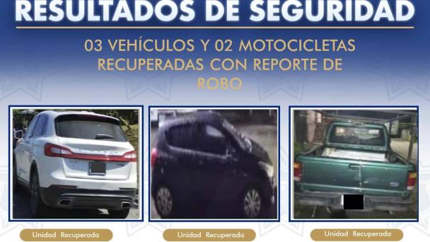 La Secretaría de Seguridad y Protección Ciudadana (SSPC) informó que recuperó cinco unidades con reporte de robo en la semana comprendida entre el 13 de febrero y el 19 de febrero.