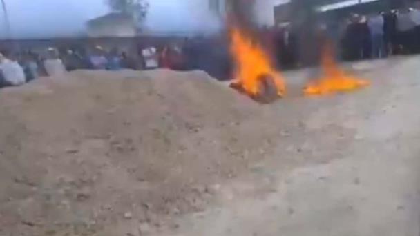 A través de un video que se viralizó en redes sociales, se muestra a decenas de ciudadanos rodeando a dos hombres que yacen en el suelo bañados de gasolina, a un costado de un montículo de tierra, cuando de la muchedumbre lanzan un cerillo hacia los detenidos, que de inmediato se prenden en llamas.