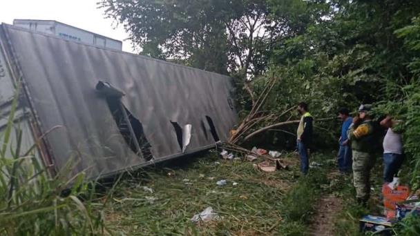 Un tráiler con mercancía diversa se salió de la carretera en la vía federal Cárdenas-Coatzacoalcos, lo cual fue aprovechado por pobladores de la zona para robarse lo que trasladaba.