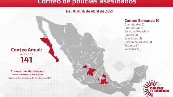 De acuerdo a la organización, en la semana del 10 al 16 de abril se contabilizaron 10 uniformados fallecidos, tres de ellos en Guanajuato, mientras que en Chihuahua, San Luis Potosí, Sonora, Querétaro, Estado de México, Tabasco y Veracruz, se registró un caso, respectivamente.