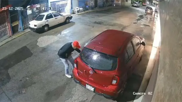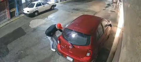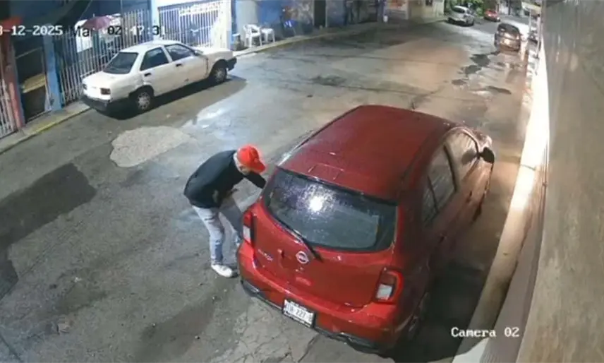 En el vídeo se observa que, alrededor de las 02:45 horas, dos sujetos se colocan frente al automóvil, marca Nissan, tipo March rojo, lentamente y mientras vigilan que nadie los vea, uno de ellos, vestido con pantalón, playera gris manga larga, gorra y una especie de pasamontañas, se acerca a la puerta de la unidad, del lado del conductor, y la abre rápidamente.