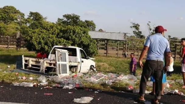 Una camioneta cargada de refrescos, se volcó sobre la carretera Villahermosa-Frontera, lo cual aprovecharon los habitantes para robarse el producto.