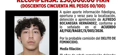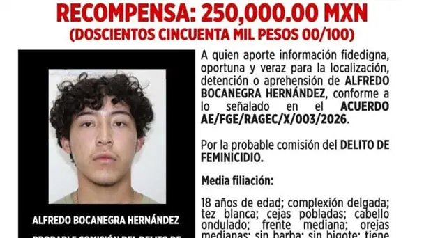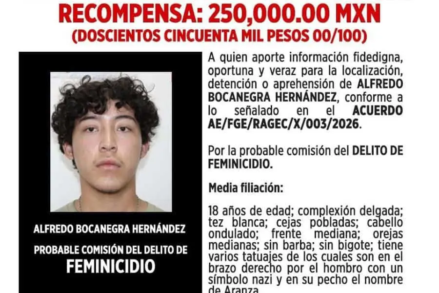 La Fiscalía General del Estado (FGE) ofrece una recompensa de 250 mil pesos a quien proporcione información que permita dar con el paradero de Alfredo Bocanegra Hernández, presunto responsable del feminicidio de una joven en el municipio de Jonuta, ocurrido el pasado 2 de enero.
