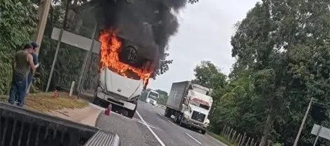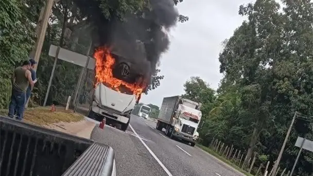 Un camión de mudanzas se incendió la mañana de este domingo sobre la carretera Cárdenas–Villahermosa, a la altura del puente Samaria.
