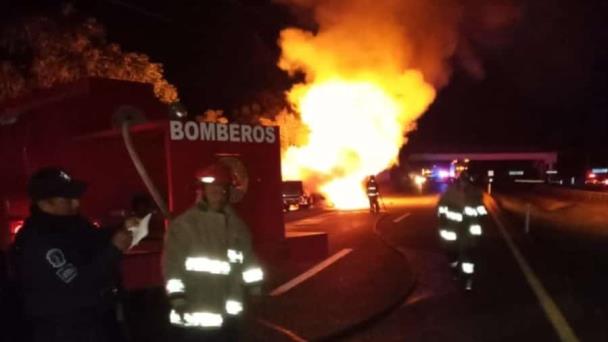 Pese a que se desconocen las causas que provocaron el incendio, al parecer el chofer perdió el control de la unidad y quedó atravesado en medio del carril de la vía.