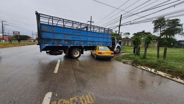 El percance se registró entre un camión pesado y una unidad del transporte público tipo taxi, perteneciente al municipio de Centro.
