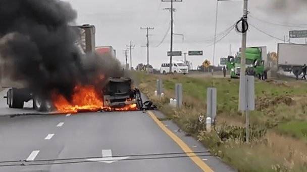 En esa zona, sujetos armados habrían despojado a conductores de sus unidades para incendiarlas, incluido un camión de pasajeros, que fue utilizado para bloquear la vialidad.