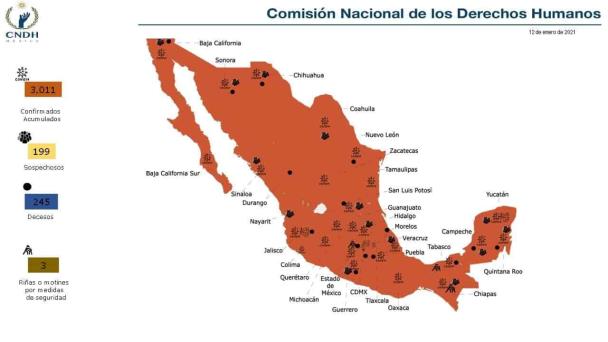 Indicó que con corte al 12 de enero, se tenía un registro de tres mil 011 casos confirmados en los centros penitenciarios federales, estatales y militares del país, así como 245 defunciones por SARS-CoV-2.