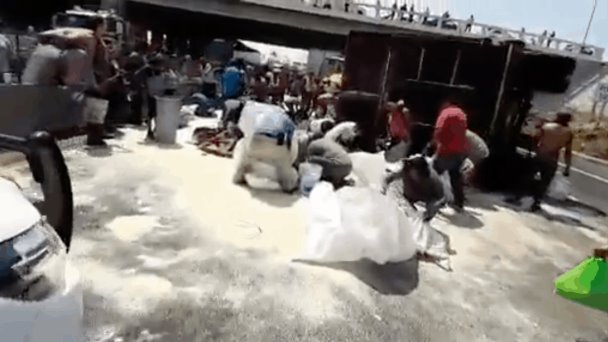 Pese a que policías estatales y federales llegaron para intentar detener el robo, las personas se retiraron hasta que el azúcar ya no se podía seguir recogiendo.