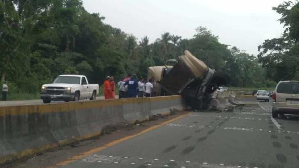 Una góndola cargada de grava, terminó volcada la tarde de este sábado sobre la vía Paraíso-Comalcalco.