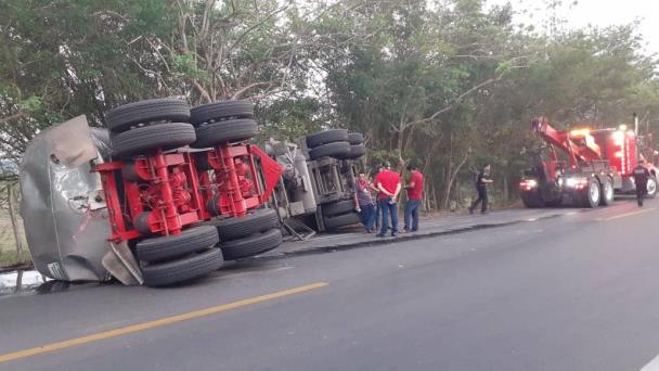 Al intentar reincorporarse a la cinta asfáltica, uno de los remolques quedó volcado, por lo que automovilistas que circulaban por la zona reportaron el hecho a las autoridades.