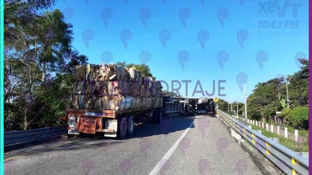 Un tráiler de doble semi-remolque que transportaba cartón se volcó la mañana de este martes en la carretera Villahermosa-Frontera, a la altura del kilómetro 8, luego que el conductor perdió el control de la unidad.