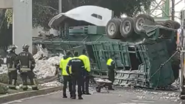 Un tráiler cargado de cebollas volcó y cayó de un distribuidor vial este viernes, en el cruce de la calzada Ignacio Zaragoza y Francisco del Paso y Troncoso, en la alcaldía Venustiano Carranza de la Ciudad de México.