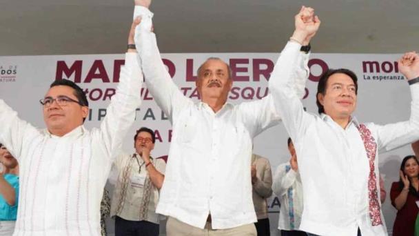 Incluso, hubo un momento en el que el gobernador Carlos Manuel Merino y el diputado Ignacio Mier le levantan la mano, mientras el legislador federal recibe el apoyo de los asistentes.