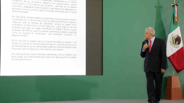 “Celebro que escritores y periodistas que han defendido desde siempre el modelo neoliberal o neoporfirista se agrupen, se definan y dejen de lado la simulación para buscar restaurar el antiguo régimen caracterizado por la antidemocracia, la corrupción y la desigualdad. La historia nos enseña -la historia, que es la maestra de la vida- que cuando se pone en práctica un proceso de transformación siempre se produce una reacción conservadora, de modo que es absolutamente legítimo que exista una oposición al gobierno que represento y a las acciones que estamos consumando”, expresó.