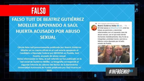 El titular del Sistema Público de Radiodifusión del Estado Mexicano, Jenaro Villamil, informó que circula en redes sociales un tuit falso atribuido a la esposa del presidente Andrés Manuel López Obrador, la doctora Beatriz Gutiérrez Müller, donde brinda su apoyo al diputado federal Benjamín Saúl Huerta.