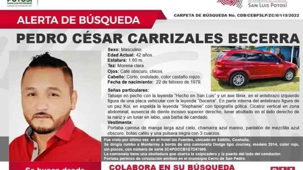 La Comisión Estatal de Búsqueda de San Luis Potosí emitió una alerta de búsqueda para localizar al exdiputado federal Pedro Carrizales Becerra, “El Mijis”, quien desapareció desde el pasado 31 de enero.