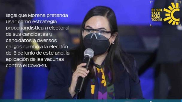Además, en ese mismo mensaje publicado en twitter, la diputada agregó una imagen con el siguiente texto: “Ilegal que Morena pretenda usar como estrategia propagandística y electoral de sus candidatos a diversos cargos rumbo a la elección del 6 de junio de este año, la aplicación de las vacunas contra el Covid-19”.