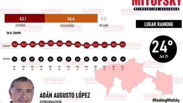 El gobernador Adán Augusto López Hernández obtuvo un 43% de aprobación ciudadana de acuerdo a la evaluación mensual hecha por Consulta Mitofsky, por lo que se ubicó en el lugar número 24 de los mandatarios estatales.