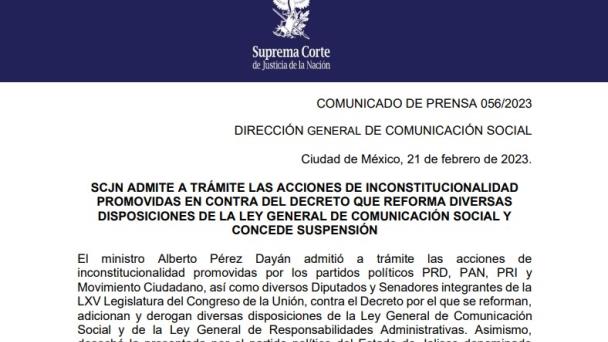 Las controversias aceptadas van en contra el Decreto por el que se reforman, adicionan y derogan diversas disposiciones de la Ley General de Comunicación Social y de la Ley General de Responsabilidades Administrativas.