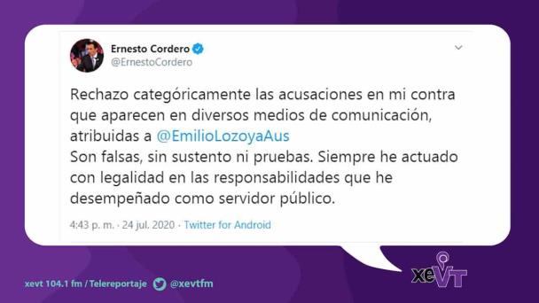 El ex senador panista, Ernesto Cordero, se deslindó de haber recibido sobornos para votar a favor de la Reforma Energética, al señalar que los señalamientos "son falsos y sin sustento”.