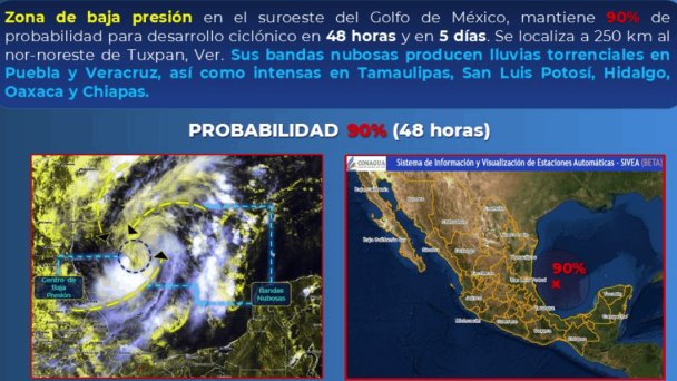 La Comisión Nacional del Agua (Conagua) informó ayer por la tarde, que se estaba desarrollando una zona de baja presión en el suroeste del Golfo de México, cuya probabilidad de desarrollarse a ciclón es del 90%, en el pronóstico a 48 horas.