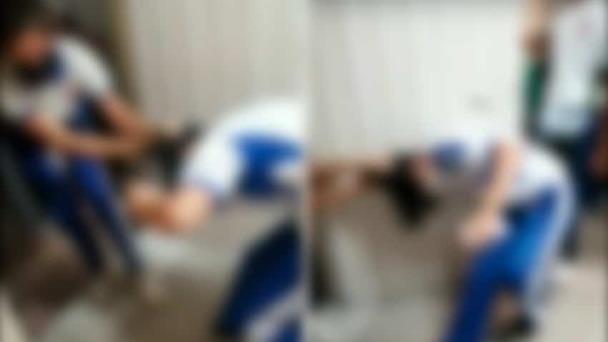 En la grabación se aprecia a una de las alumnas jalar del cabello a su compañera y llevarla hasta la puerta del salón, mientras que la otra jovencita se resiste, y al final, cae al suelo.