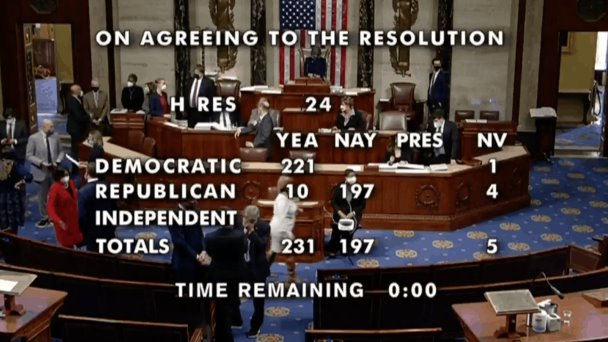 La resolución obtuvo 232 votos a favor (10 de los republicanos) y 197 en contra, con esto Trump se convierte en el primer mandatario en la historia del país norteamericano en enfrentar un juicio de destitución dos veces.